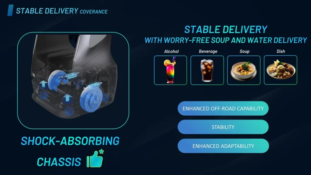 Our Voyager robot smoothly glides at a speed of 0.8 m/s, capable of carrying loads up to 40 kg. With a battery life of over 12 hours, it’s the long-lasting workhorse that ensures your service remains efficient.